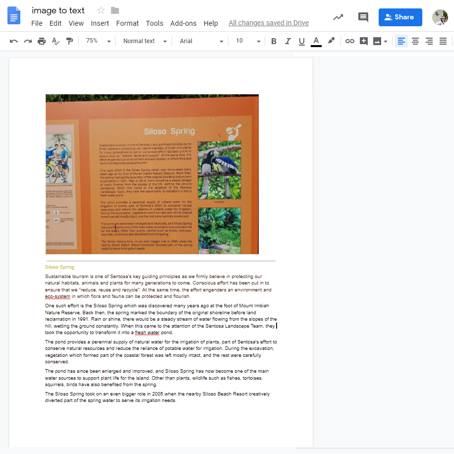 You just have to upload the picture to Google drive and then in Google drive open the picture with Google Docs. The original image plus the converted text is shown! Its so very useful!